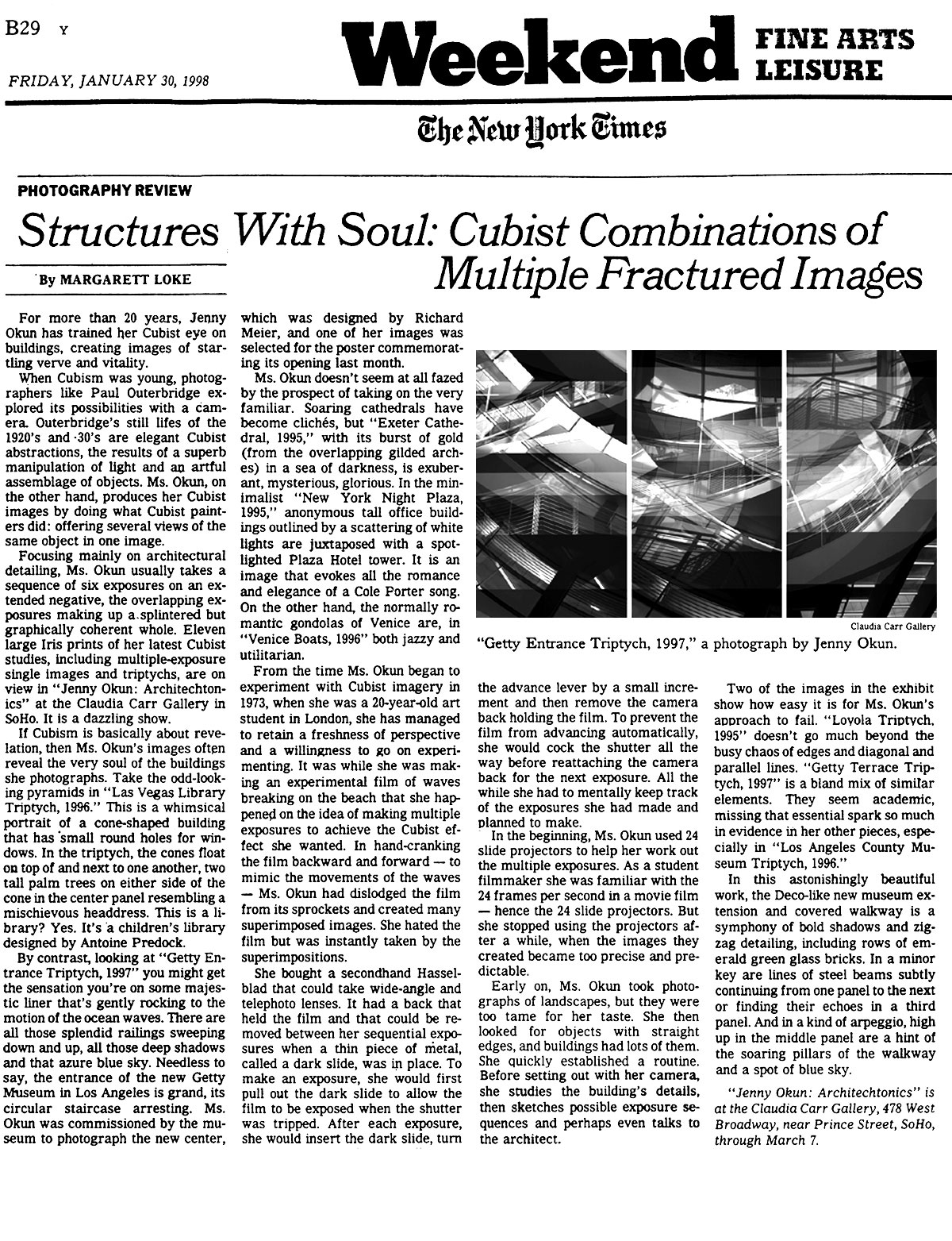 Brentwood Magazine (text only) "Deconstructing Structure : Jenny Okuns pictures play with pre-existing form" by Katy Harris. Summer 1999 PDF page 1